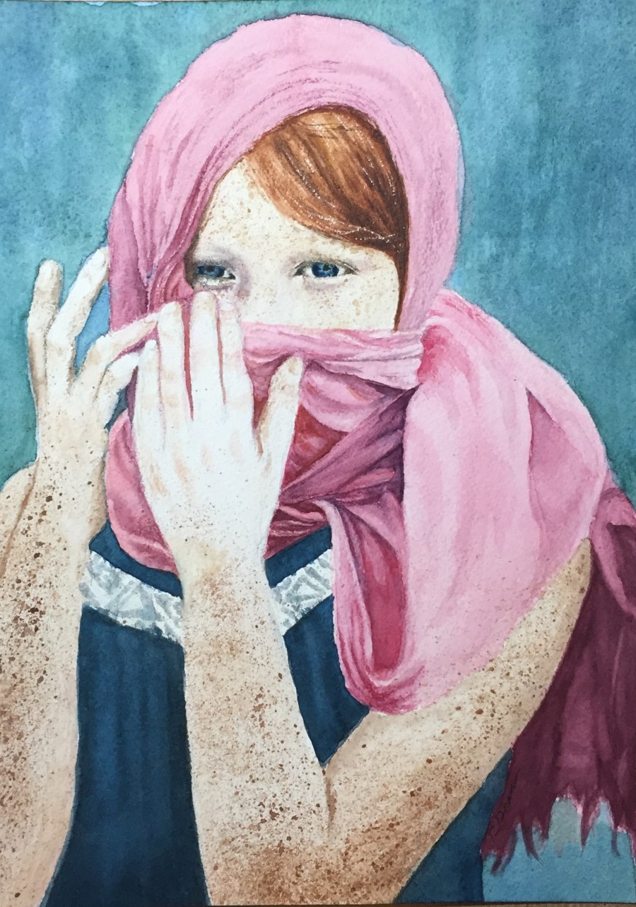 Emily - Imagine - 9" x 12" Watercolor on Paper This portrait was so much fun to work on. When I saw the photograph done by my daughter, Miriam Doan - with all those fabulous freckles and red hair, the beautifully draped scarf delicately held back by gentle hands, the lace and color of the …
