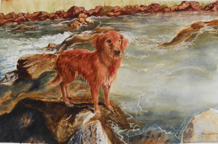 Lucy was commissioned and she was a joy to work on. She is painted on 140 lb. Arches cold pressed paper 1/2 imperial sheet: about 13 x 20. Colors from M. Graham, Daniel Smith and Winsor & Newton tubes: Rocks - Burnt umber, winsor violet, raw sienna, quinacridone gold - foreground rocks have a little …